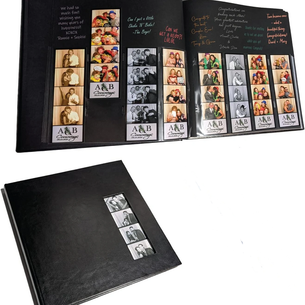 Upgrade your rental with a custom photo booth album — a perfect way to relive the best moments from your big day. As guests take photos, they can leave a copy in the album and write a personal message alongside it. Our sleek black albums include acid-free pages and protective sleeves, making them a beautiful, lasting keepsake of your wedding celebration.